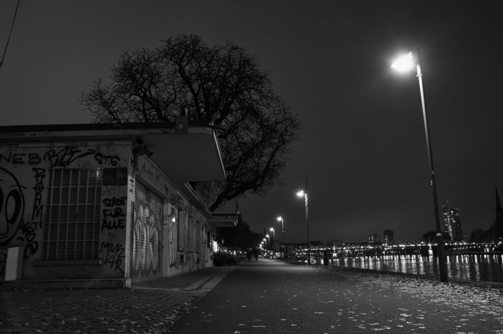 Am Abend leeren sich dann auch merklich die Strassen bzw. das Main Ufer. Das ist dann der Moment den ich gerne zum Fotografieren nutze, weil dann einfach keine Menschen im Bild rumschwirren bzw. man sich nicht um die DSGVO kümmern muss….weil ja das „Recht am eigenen Bild“ dem deutschen Gesetzgeber so wichtig ist und man in Deutschland ja per se mehr oder weniger hypersensibel ist, sobald ein Mensch mit einer Kamera in die gleiche Richtung fokussiert in der man steht.